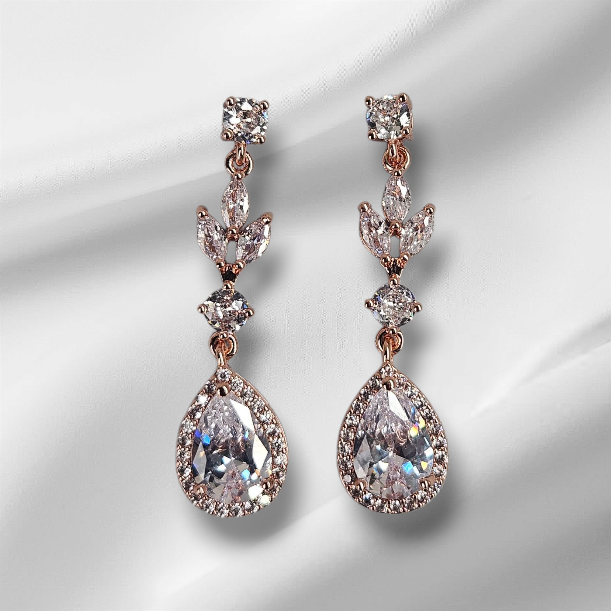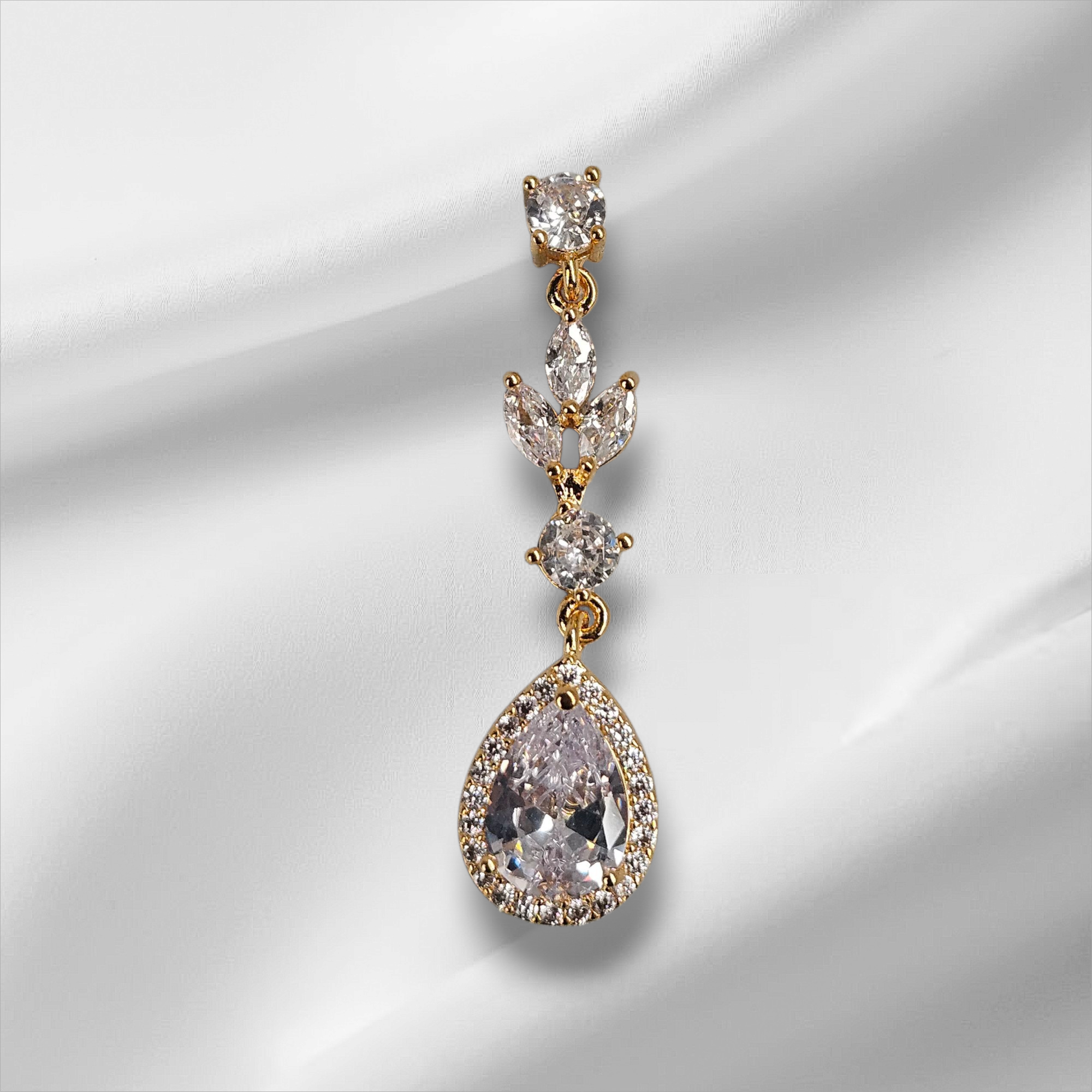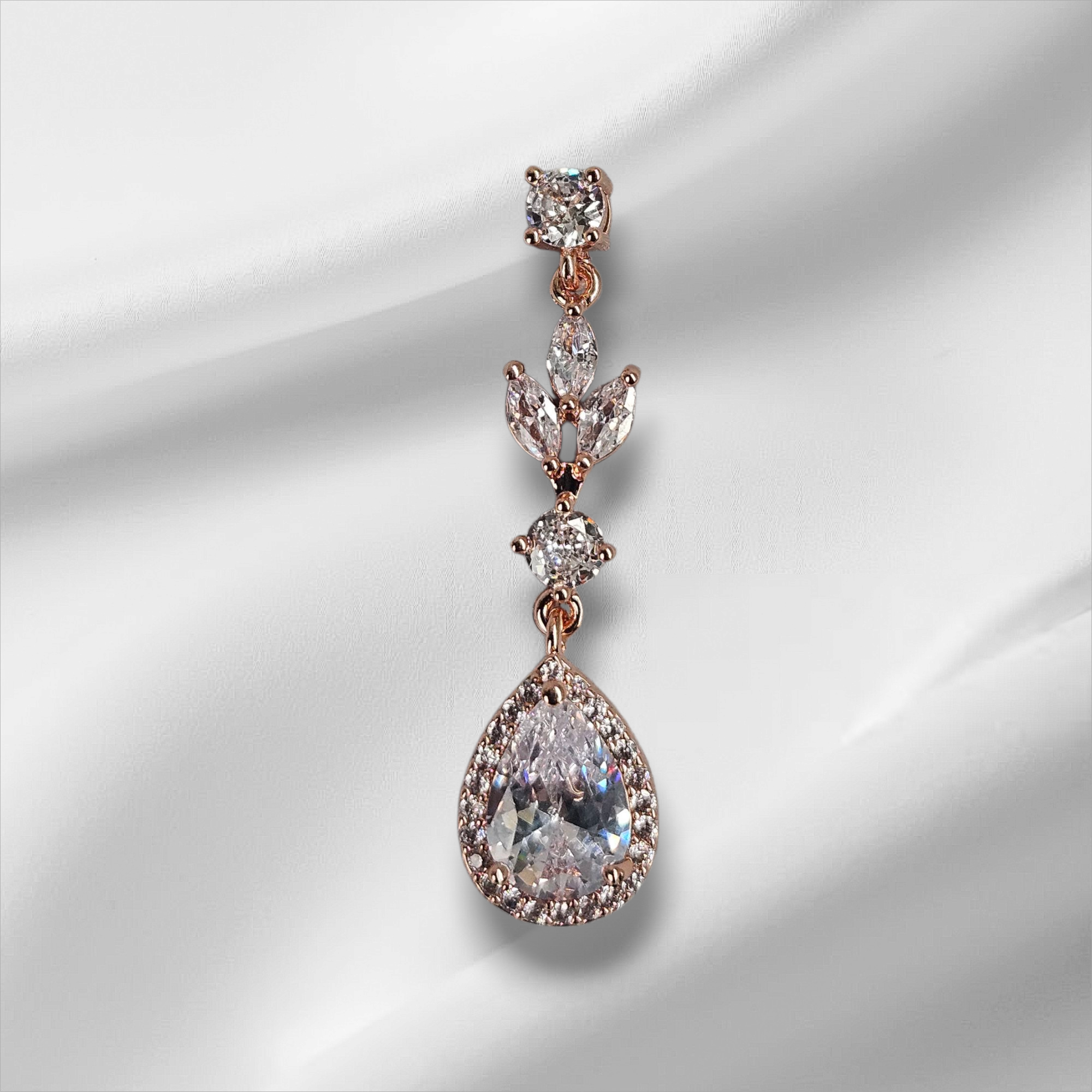 Estos aretes en tono plata son el complemento perfecto para cualquier look elegante. Su diseño de hojas finamente trabajadas y una gota brillante crean un acabado sofisticado y refinado.