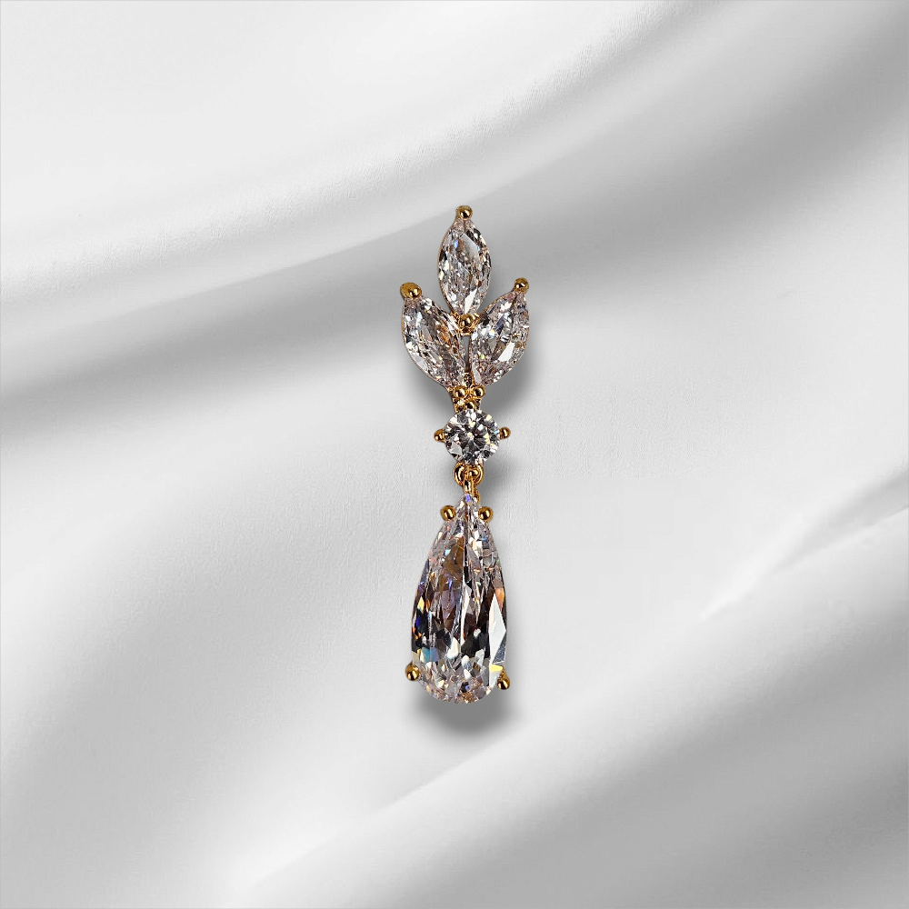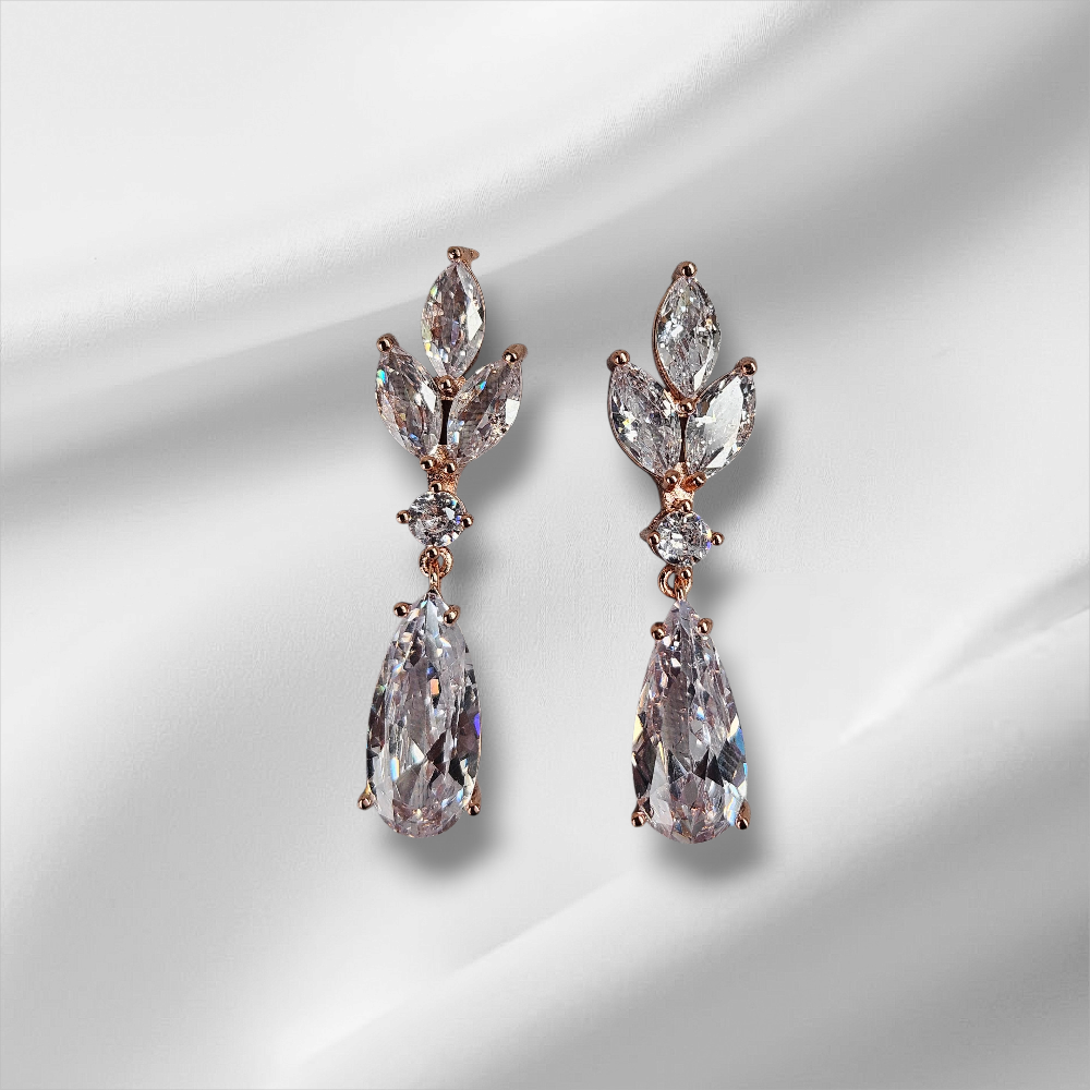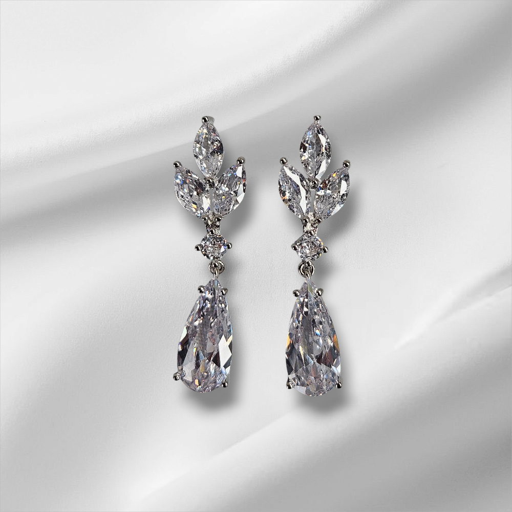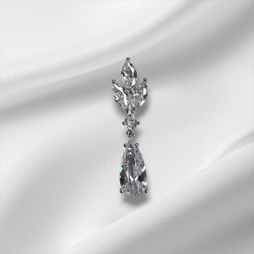Estos aretes en tono plata son el complemento perfecto para cualquier look elegante. Su diseño de hojas finamente trabajadas y una gota brillante crean un acabado sofisticado y refinado.