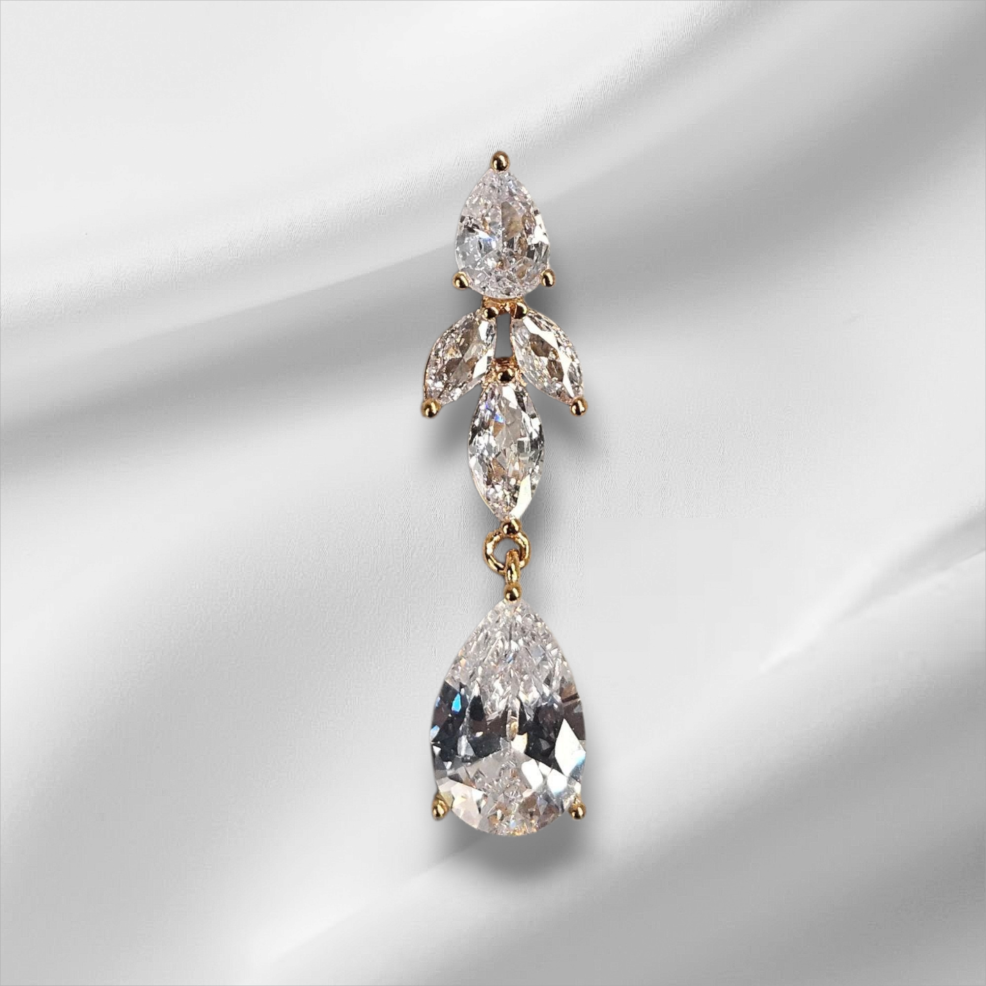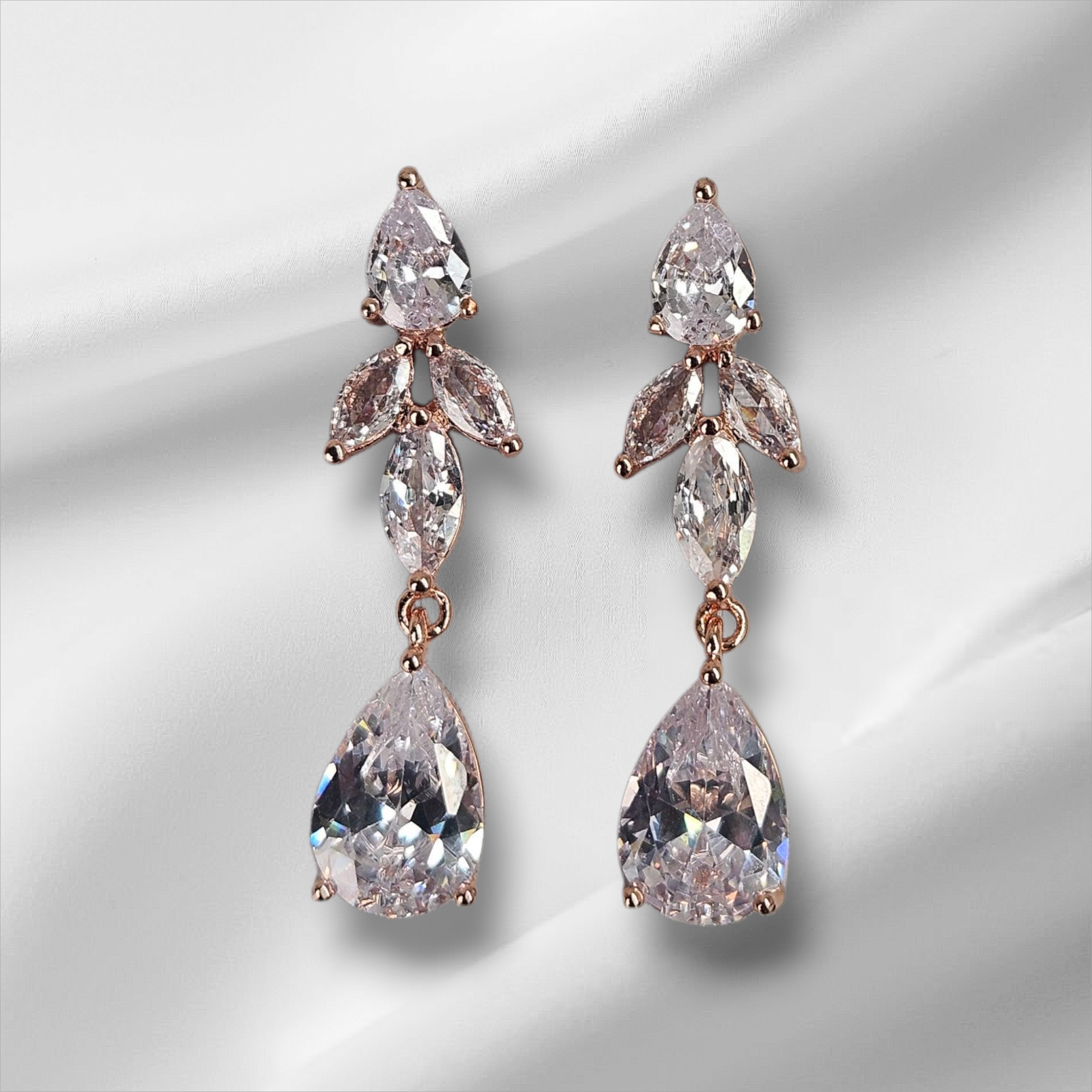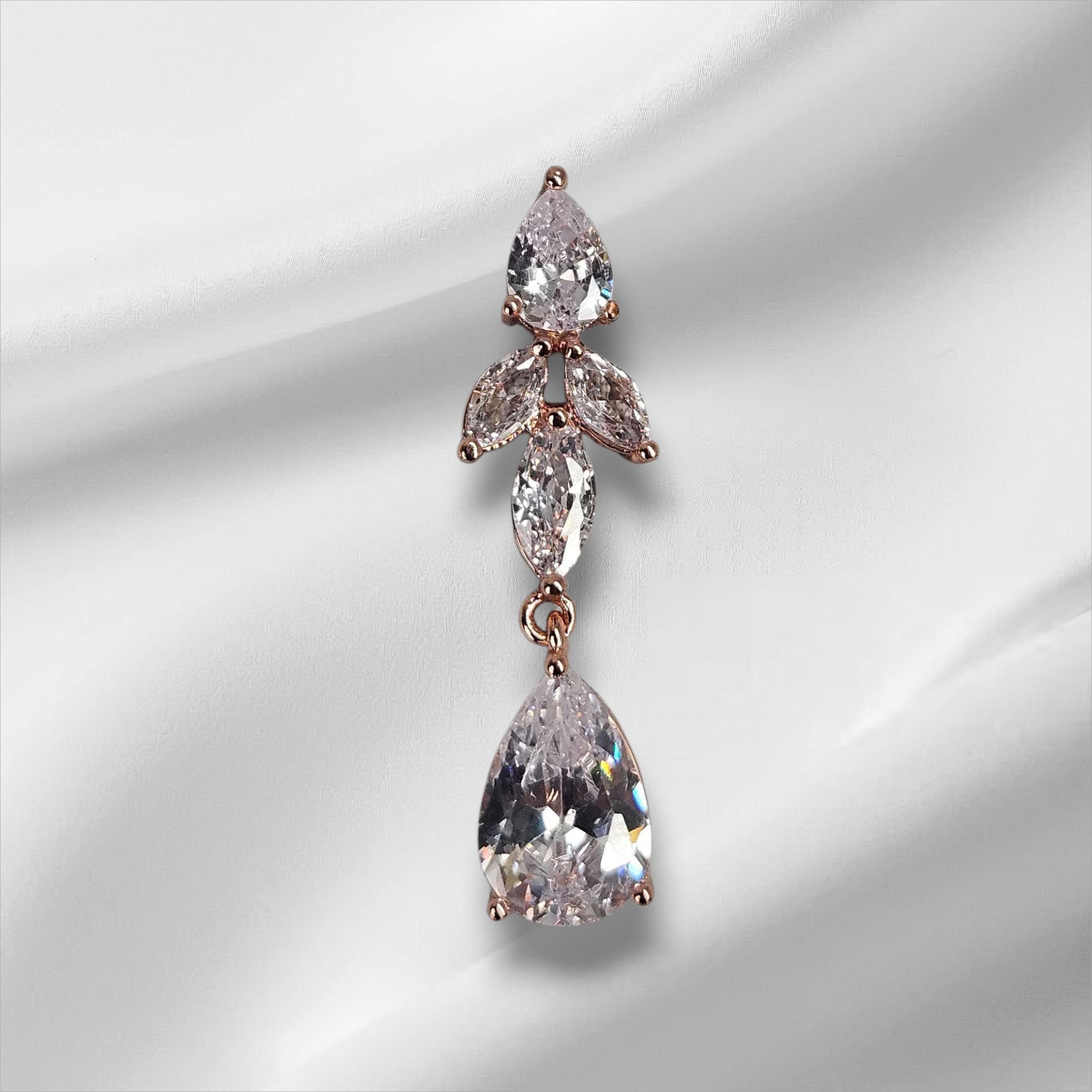 Estos aretes en tono plata son el complemento perfecto para cualquier look elegante. Su diseño de hojas finamente trabajadas y una gota brillante crean un acabado sofisticado y refinado.